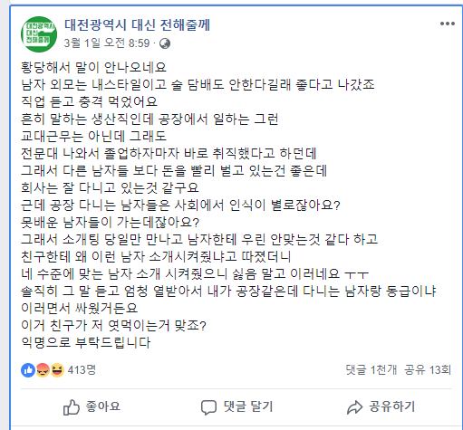 남자 직업이 마음에 안드는 여자.jpg 작성자간호사|작성시간19.03.09|조회수5,210 목록 댓글 11 글자크기 작게가 글자크기 크게가 . 다음검색 현재 게시글 추가 기능 열기 북마크 공유하기 신고 센터로 신고 댓글 댓글 11 댓글쓰기 답글쓰기 댓글 리스트 작성자준 호 | 작성시간 19.03.09 ㅋㅋㅋ 친구가 수준에맞는 남자 소개시켜준거라 했으면 본인도 한번 돌아보길 작성자nhyg | 작성시간 19.03.09 남자가 잘 피해갔네 작성자집배원 | 작성시간 19.03.09 생각보다 저런여자 많아요ㅋㅋ 작성자10베르캄프 | 작성시간 19.03.09 남자에게 다행이네요 작성자하얗게불태웠어 | 작성시간 19.03.09 이게 말이여 방구여 댓글 전체보기