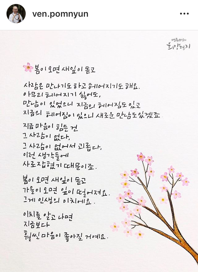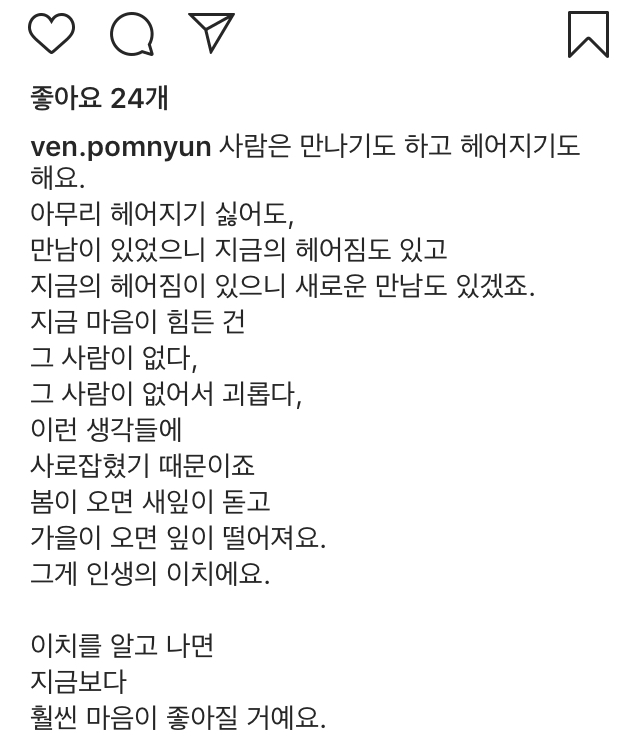 법륜 스님 인스타 작성자데얀골|작성시간19.03.22|조회수906 목록 댓글 1 글자크기 작게가 글자크기 크게가 . 다음검색 현재 게시글 추가 기능 열기 북마크 공유하기 신고 센터로 신고 댓글 댓글 1 댓글쓰기 답글쓰기 댓글 리스트 작성자성남전위대장 | 작성시간 19.03.22 일반인들은 스님의 말슴처럼 살아가기 힘듭니다... 저두 마찬가지죠... 댓글 전체보기