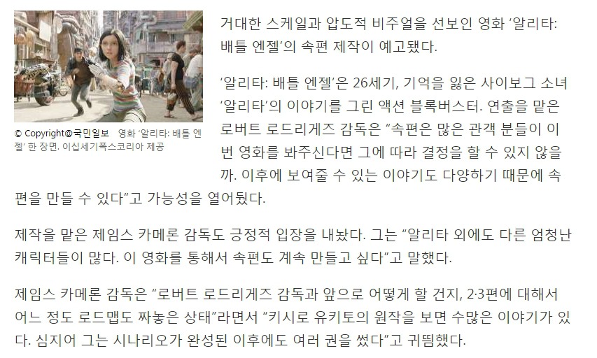 제임스 카메론 "'알리타' 속편 계혹 만들고 싶다"