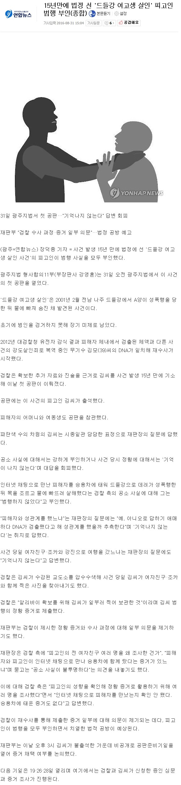 15년만에 법정 선 '드들강 여고생 살인' 피고인 범행 부인(종합) 작성자노홍철길|작성시간16.08.31|조회수435 목록 댓글 1 글자크기 작게가 글자크기 크게가 http://news.naver.com/main/read.nhn?mode=LSD&mid=shm&sid1=102&oid=001&aid=0008653826 다음검색 현재 게시글 추가 기능 열기 북마크 공유하기 신고 센터로 신고 댓글 댓글 1 댓글쓰기 답글쓰기 댓글 리스트 작성자농구공 | 작성시간 16.08.31 그것이 알고싶다 봤는데 거기에 또 다른 미제사건도 빨리 풀렸으면 좋겠네요 댓글 전체보기