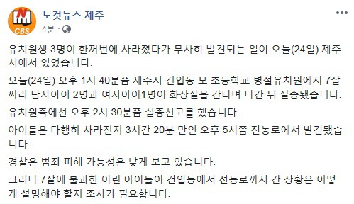 (속보) 제주시 유치원생 3명 한꺼번에 실종되었다가 3시간만에 무사히 발견 작성자풍백소년|작성시간19.04.24|조회수3,332 목록 댓글 7 글자크기 작게가 글자크기 크게가 건입동 모 초등학교 병설유치원 = 제주 동초등학교인듯...해당 유치원에서 발견장소인 전농로까지는 2.1km에서 2.4km정도 거리이고어른 기준으로 소요시간이 35-40분 걸리는 거리인데... 다음검색 현재 게시글 추가 기능 열기 북마크 공유하기 신고 센터로 신고 댓글 댓글 7 댓글쓰기 답글쓰기 댓글 리스트 작성자캡틴 라텔 | 작성시간 19.04.24 휴 다행이네 작성자_-혀니-_ | 작성시간 19.04.24 걸어서 가기에 충분히 가능한 거리긴 합니다. 찾아서 다행이네요. 작성자수눤믈누뉭스 | 작성시간 19.04.24 분명 누군가 납치하려다 그만둔거같은데 애들이 말하겠죠뭐 작성자샤이바니 | 작성시간 19.04.24 일단 다행ㅠ아이 가족들이나 유치원 선생들이나 얼마나 가슴졸였을까ㅠ 작성자뚜와이씨 | 작성시간 19.04.24 다행이다 ㄷㄷ 댓글 전체보기