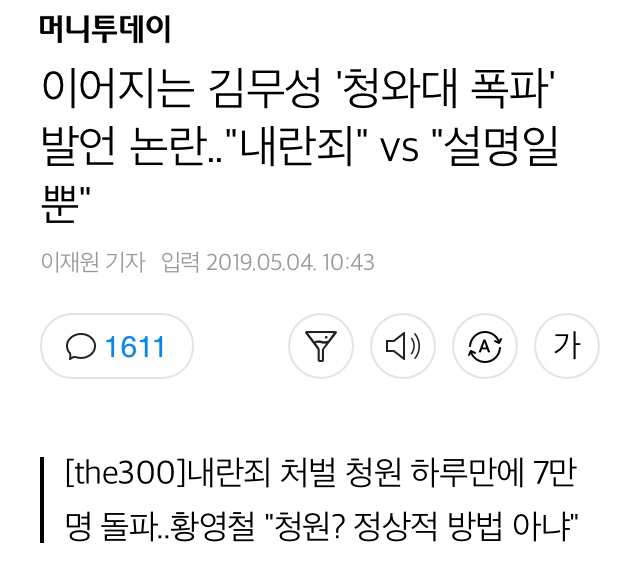 작성자정정수 작성시간 19.05.04 응 내란죄. 반대로 국무회의에서 농담조로라도 자한당 사무실 폭파시켜야겠네 했으면 언론놈들이나 저놈들이나 어찌나올찌 뻔함