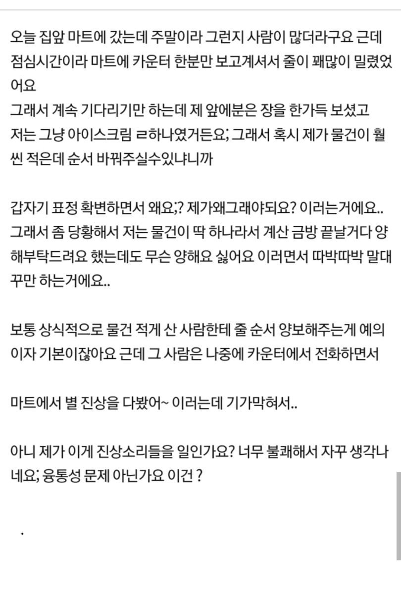 마트에서 줄 양보 해달라했다가 진상소리 들었어요....jpg 작성자Sven Kramer|작성시간19.05.12|조회수4,429 목록 댓글 33 글자크기 작게가 글자크기 크게가 ㅊㅊ ㅡ 더쿠 다음검색 현재 게시글 추가 기능 열기 북마크 공유하기 신고 센터로 신고 댓글 댓글 33 댓글쓰기 답글쓰기 댓글 리스트 작성자파비딕 | 작성시간 19.05.12 저라면 해주려다가 저말듣고 안해줌 ㅋㅋㅋㅋ 작성자잠온다잠와 | 작성시간 19.05.12 카트로 대가리를 찍혀봐야 정신차리지 작성자JTBC | 작성시간 19.05.12 앞사람이 먼저 가라고하는거면몰라도ㅋㅋ따박따박 말대꾸는 뭐고 누구맘대로 예의고 기본이야ㅋㅋㅋ 작성자힘을내요!슈퍼파월 | 작성시간 19.05.12 까고 있네 작성자빨간색 | 작성시간 19.05.13 본인이 진상인줄 모르는게 레알 진상이지 댓글 전체보기