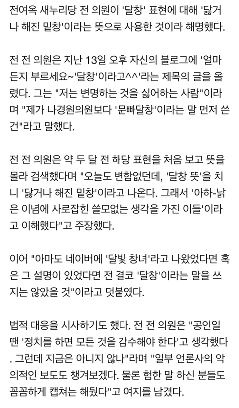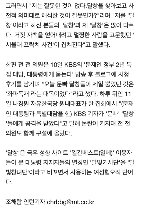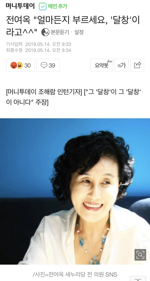 [정치]전여옥 "얼마든지 부르세요, '달창'이라고^^" 작성자Darth Vader|작성시간19.05.14|조회수4,089 목록 댓글 39 글자크기 작게가 글자크기 크게가 https://m.news.naver.com/read.nhn?mode=LSD&mid=sec&sid1=100&oid=008&aid=0004217874 다음검색 현재 게시글 추가 기능 열기 북마크 공유하기 신고 센터로 신고 댓글 댓글 39 댓글쓰기 답글쓰기 댓글 리스트 작성자10. Messi | 작성시간 19.05.14 여윽시 어디 안가지 작성자퀵빛짹푼핸♥ | 작성시간 19.05.14 짜져라 작성자jEnTle | 작성시간 19.05.14 이번에 공천 하나 기대하는건가 작성자노랑희망 | 작성시간 19.05.14 진짜 ㅁㅊ것들 천지네 작성자JEONBUKFC | 작성시간 19.05.14 가서 달창이라고 불러주고 와야겠구만 댓글 전체보기