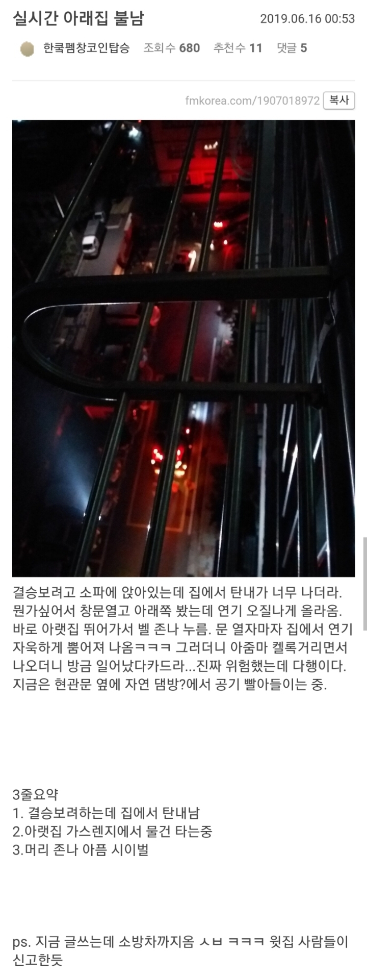 [스크랩] U-20 축구결승 보려는데 아랫집 불난 펨코인 작성자actual grace|작성시간19.06.16|조회수3,706 목록 댓글 6 글자크기 작게가 글자크기 크게가 펨코는 축구커뮤니티임안전하게 진압 됐기를 다음검색 스크랩 원문 : 이종격투기 현재 게시글 추가 기능 열기 북마크 공유하기 신고 센터로 신고 댓글 댓글 6 댓글쓰기 답글쓰기 댓글 리스트 작성자텐타시온 | 작성시간 19.06.16 와 잘하셨다 벨 누른거 작성자Lumos maxima | 작성시간 19.06.16 축구 안했으면 큰일났겠넺ㄷㄷ 작성자Pringles_ cheesy cheese | 작성시간 19.06.16 정말 잘하셨어요. 작성자우주성 | 작성시간 19.06.16 진짜 큰일날뻔ㄷㄷ 작성자어른돼지 | 작성시간 19.06.16 다행 댓글 전체보기