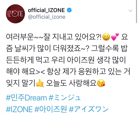 [아이돌]아이즈원 공식 트위터 김민주, 민주Dream 작성자은달_나코|작성시간19.07.11|조회수813 목록 댓글 4 글자크기 작게가 글자크기 크게가 . 다음검색 현재 게시글 추가 기능 열기 북마크 공유하기 신고 센터로 신고 댓글 댓글 4 댓글쓰기 답글쓰기 댓글 리스트 작성자박정화 | 작성시간 19.07.11 밍구리🐸 작성자Kaywoo | 작성시간 19.07.11 민주 바보 작성자아이즈원 김민주 | 작성시간 19.07.11 아이즈원 김민주 작성자lZ*ONE 김민주 | 작성시간 19.07.11 댓글 전체보기