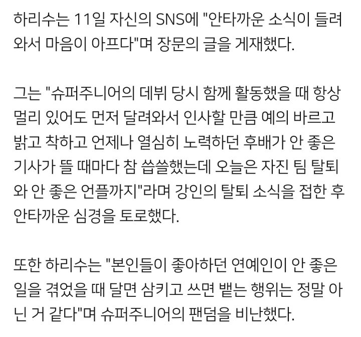 [연예]하리수, 강인 탈퇴 소식에 팬덤 비난 "착한 후배, 씁쓸하다" 작성자TAEYEON|작성시간19.07.11|조회수2,966 목록 댓글 30 글자크기 작게가 글자크기 크게가 하리수, 강인 탈퇴 소식에 팬덤 비난 [마이데일리 = 명희숙 기자] 가수 하리수가 슈퍼주니어 강인의 탈퇴 소식에 심경을 전했다. 하리수는 11일 자신의 SNS에 n.news.naver.com 범죄만 몇번인데 뭐가 착하다는거야 다음검색 현재 게시글 추가 기능 열기 북마크 공유하기 신고 센터로 신고 댓글 댓글 30 댓글쓰기 답글쓰기 댓글 리스트 작성자마하마차 | 작성시간 19.07.11 이건 좀;; 작성자정준하딸 | 작성시간 19.07.11 되게 멍청하네 작성자잠온다잠와 | 작성시간 19.07.11 걍 닥치고있자 작성자TheLegend | 작성시간 19.07.11 언제부터 술쳐먹고 사고치는게 착한거 였지 작성자나이키 | 작성시간 19.07.12 개노답이네 강인이 그동안 한 범죄가 얼만데 무슨 댓글 전체보기