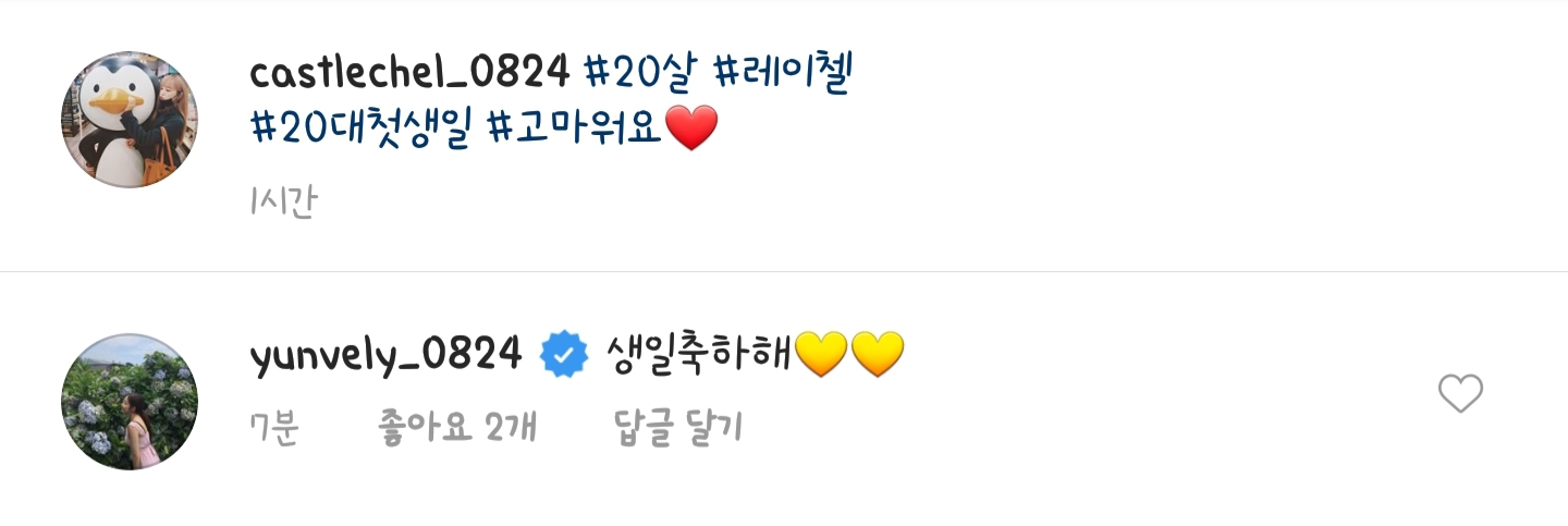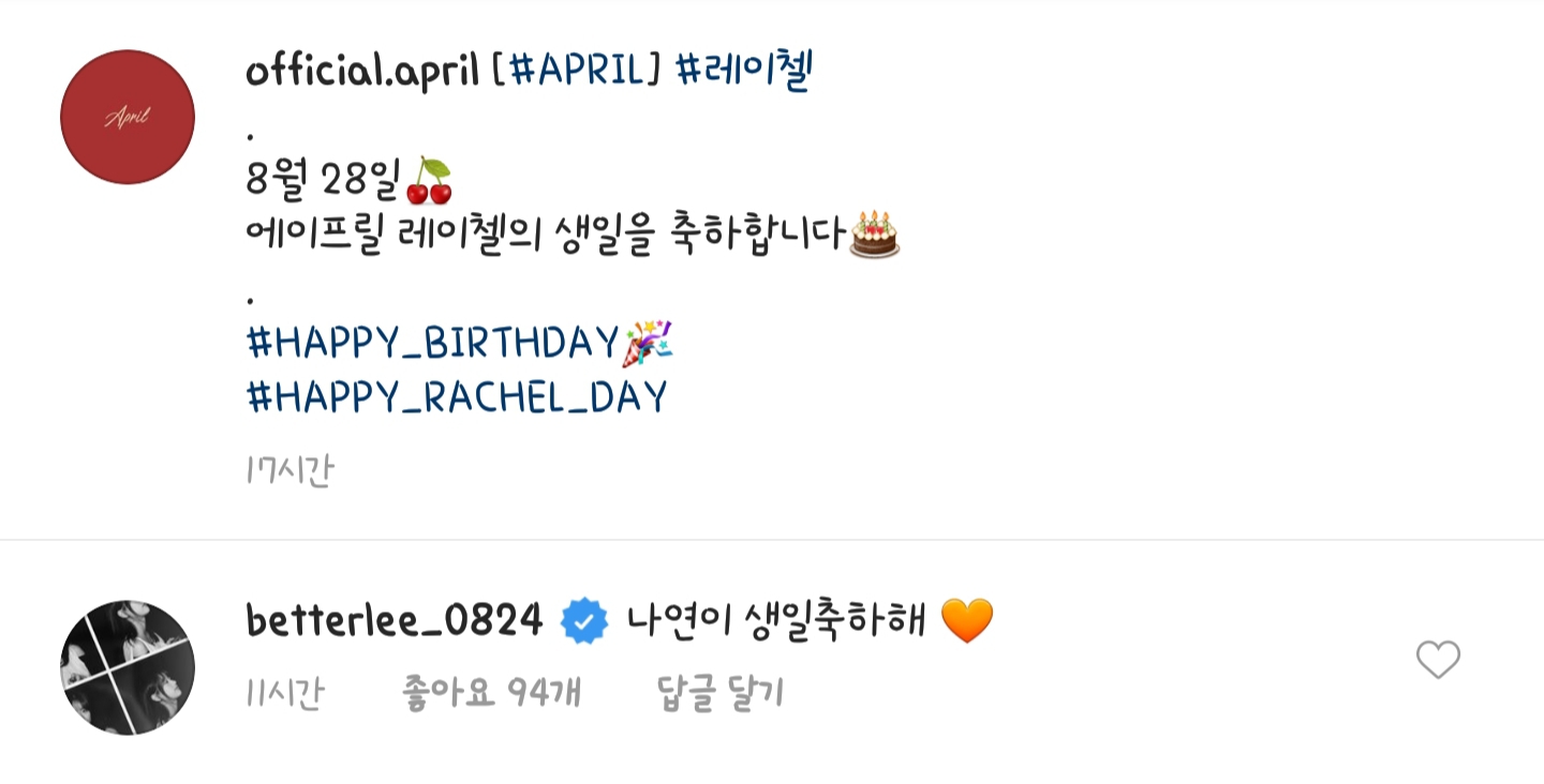 [아이돌]오늘은 에이프릴 레이첼의 20번째 생일입니다 작성자이나은❤|작성시간19.08.28|조회수544 목록 댓글 4 글자크기 작게가 글자크기 크게가 출생 2000. 08. 28.에이프릴 레이첼의 20번째 생일을 축하합니다~~❤❤🎂🎂에이프릴 멤버들의 생일 축하 메시지에이프릴 양예나에이프릴 이나은에이프릴 이진솔에이프릴 김채원에이프릴 윤채경 다음검색 현재 게시글 추가 기능 열기 북마크 공유하기 신고 센터로 신고 댓글 댓글 4 댓글쓰기 답글쓰기 댓글 리스트 작성자Kaywoo | 작성시간 19.08.28 나연이의 생신을 경축드립니다 작성자여자친구 유주 | 작성시간 19.08.28 성나연 작성자볼보xc90 | 작성시간 19.08.28 생축생축 작성자Jeze | 작성시간 19.08.28 댓글 전체보기
