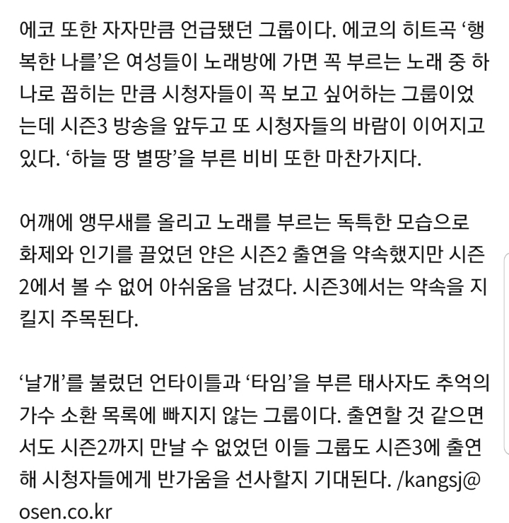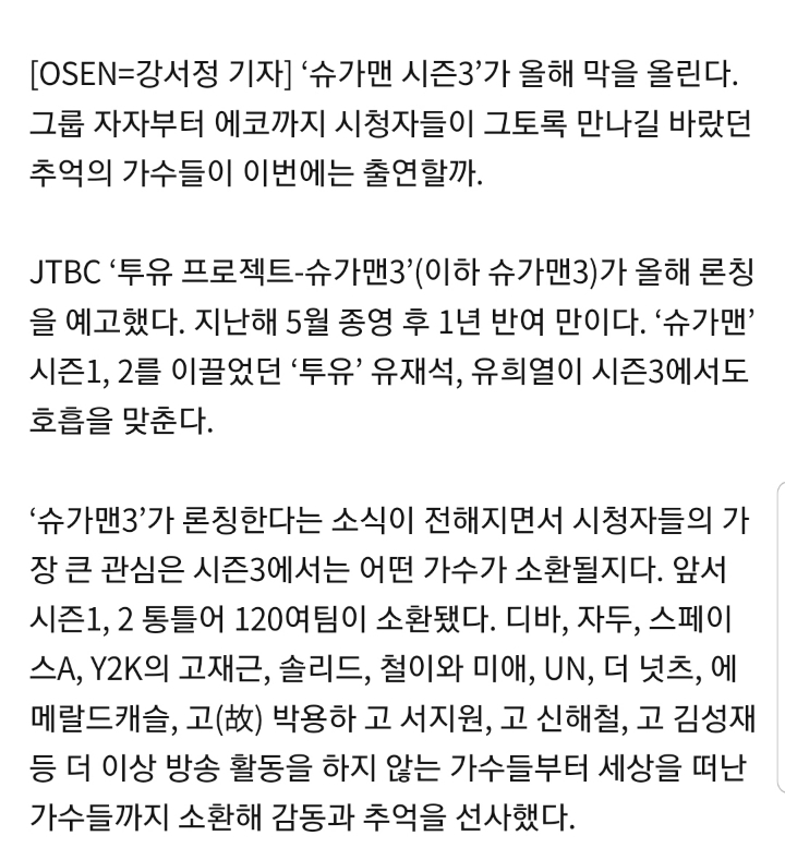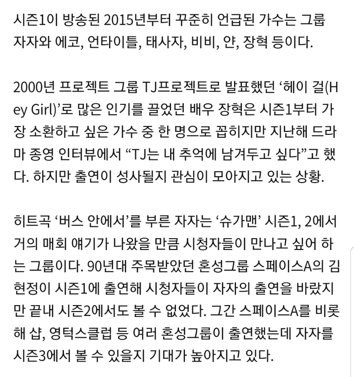 슈가맨 아까운게 슈가맨1에서 마지막쯤부터 갑자기 평소랑 다르게 맨날 막 4명씩 불러서 노래한곡만 하고 근황토크 대충하고 끝내버려서.. 좋은 게스트들을 낭했음..