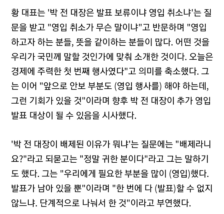 [정치]황교안 "배제라니요? 박찬주는 정말 귀한 분" 작성자Dīogo Dalot|작성시간19.10.31|조회수1,601 목록 댓글 27 글자크기 작게가 글자크기 크게가 (중략) (중략) 황교안 [곽재훈 기자] 자유한국당이 내년 총선을 대비한 1차 인재영입 발표 및 환영식을 열었지만, 의도와는 달리 황교안 대표의 리더십 논란, 당 지도부 간 소통 부재설 등만 부각됐다. 발표를 앞두고 막판에 '공관병 갑질' 논란 당사자인 박찬주 예비역 육군대장의 영입 발표가 보류되면서다. 한국당은 31일 오전 국회에서 연 영입인사 발표 및 환영식에서 경제 전문가news.v.daum.net 다음검색 현재 게시글 추가 기능 열기 북마크 공유하기 신고 센터로 신고 댓글 댓글 27 댓글쓰기 답글쓰기 댓글 리스트 작성자심곡동 득점왕 | 작성시간 19.10.31 교안 성님 지금처럼 부탁드립니다 작성자우주성 | 작성시간 19.10.31 교안이형 우리 오래 보자 작성자깜지이잉 | 작성시간 19.10.31 ㅋㅋㅋㅋㅋㅋ 작성자간장계란 | 작성시간 19.10.31 20대 군인들은 생각안하나 보네 ㅋㅋ 청년층 아몰랑~ 작성자강남건물주 | 작성시간 19.11.03 진짜 황교안 감각이 없다!안타깝다.중도층을 못 데려오겠네 댓글 전체보기