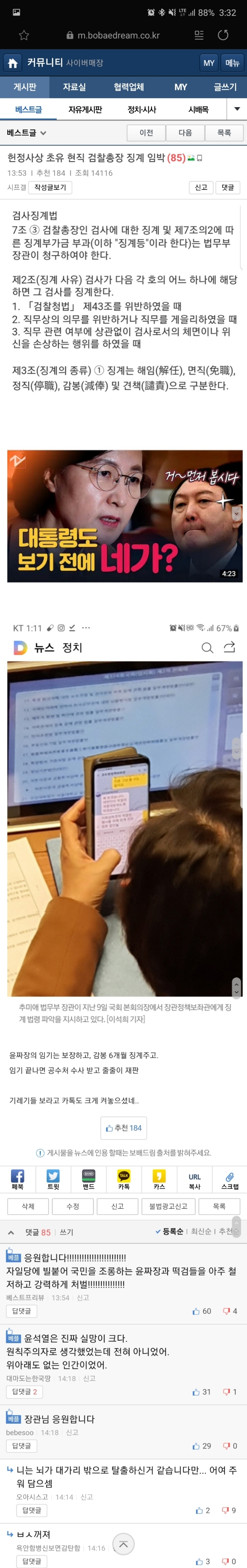 헌정사상 초유 현직 검찰총장 징계 임박 작성자popopopo|작성시간20.01.10|조회수6,317 목록 댓글 33 글자크기 작게가 글자크기 크게가 춘장아 깜빵가자 다음검색 현재 게시글 추가 기능 열기 북마크 공유하기 신고 센터로 신고 댓글 댓글 33 댓글쓰기 답글쓰기 댓글 리스트 작성자대머리 | 작성시간 20.01.10 억지로 보라고 카톡 하시네 작성자Eduardo da Silva | 작성시간 20.01.10 응원합니다 작성자Roro | 작성시간 20.01.10 매 맞자 작성자DKJUNE | 작성시간 20.01.10 장관님 정말 대단하심 작성자김밥아저씨 | 작성시간 20.01.10 가장 좋은건 화합이긴한데행정부가 너무 정치화 돼서 보기는 좀 그렇네 댓글 전체보기