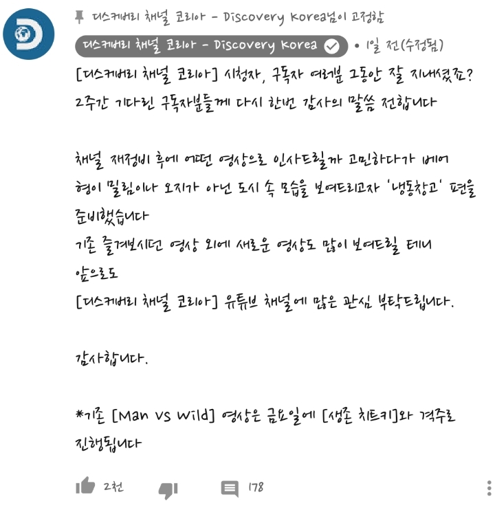 1. 디스커버리 채널 코리아 재정비 마치고 베어그릴스 영상으로 복귀.
