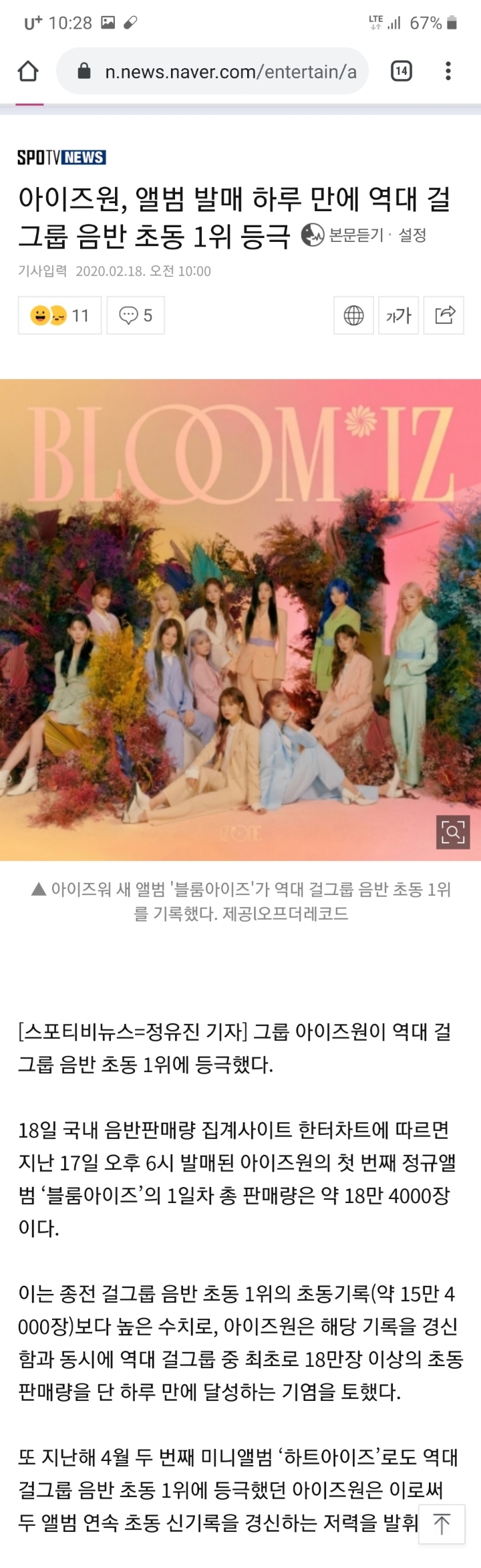 아이즈원, 앨범 발매 하루 만에 역대 걸그룹 음반 초동 1위 등극 작성자스토브리그|작성시간20.02.18|조회수1,739 목록 댓글 21 글자크기 작게가 글자크기 크게가 https://n.news.naver.com/entertain/article/477/0000232702 다음검색 현재 게시글 추가 기능 열기 북마크 공유하기 신고 센터로 신고 댓글 댓글 21 댓글쓰기 답글쓰기 댓글 리스트 작성자♡Vatreni♡ | 작성시간 20.02.18 팬들이 더 싫어요... 작성자밤을 메아리치다 | 작성시간 20.02.18 때가 왔어 오랜 기다림을 끝내 움츠렸던 맘을 일으켜, 피에스타 첫구절 작성자차니 | 작성시간 20.02.18 어휴 제정신인가 싶다그 가수에 그 팬이네 역시 끼리끼리 논다더니 답댓글 작성자♡Vatreni♡ | 작성시간 20.02.18 22 작성자워녕 | 작성시간 20.02.18 짝짝 댓글 전체보기