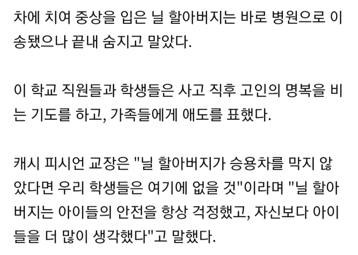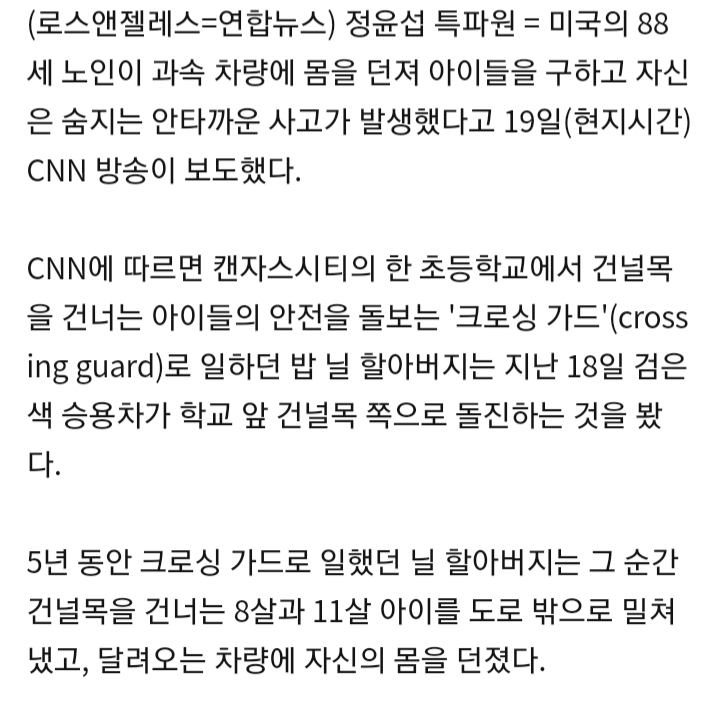 미국 88세 '건널목 안전 지킴이', 몸 던져 아이 둘 구하고 숨져 작성자S&K`|작성시간20.02.20|조회수1,036 목록 댓글 2 글자크기 작게가 글자크기 크게가 https://n.news.naver.com/article/001/0011413795?sid=104 다음검색 현재 게시글 추가 기능 열기 북마크 공유하기 신고 센터로 신고 댓글 댓글 2 댓글쓰기 답글쓰기 댓글 리스트 작성자쑤웅가 | 작성시간 20.02.20 아..안타깝다..ㅜ 작성자퀵빛짹푼핸♥ | 작성시간 20.02.20 할아버지 ㅠㅠ 댓글 전체보기