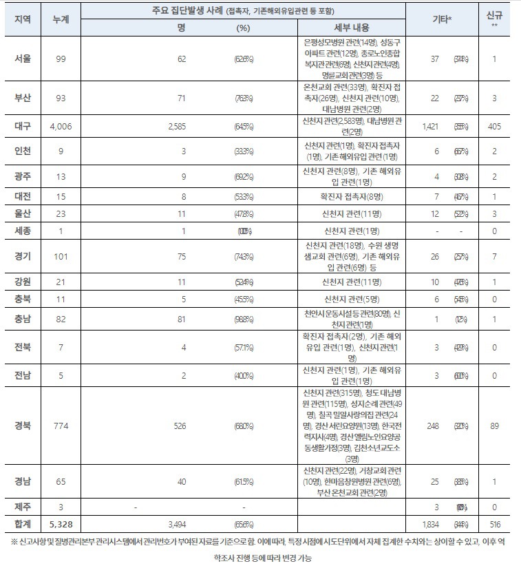 ○ 대구에서는 신천지대구교회 관련 발생이 64.5%(2,583명)로 가장 많고, 신천지 신도들에 대한 접촉자 조사 과정에서 집단시설, 의료기관 등을 중심으로 발생을 추가로 확인하여 조치 중에 있다.