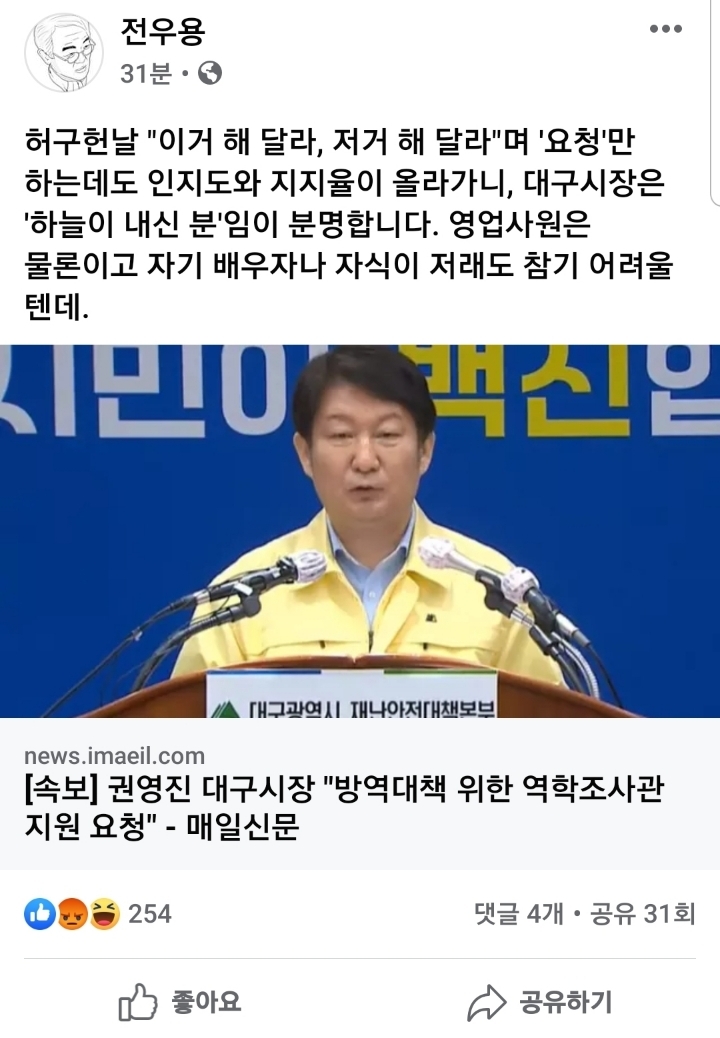 작성자Google 작성시간 20.03.20 대구 상황이 심각하다면 역학조사관 많이 파견하는 것도 합리적인 의사결정으로 보입니다만🤔