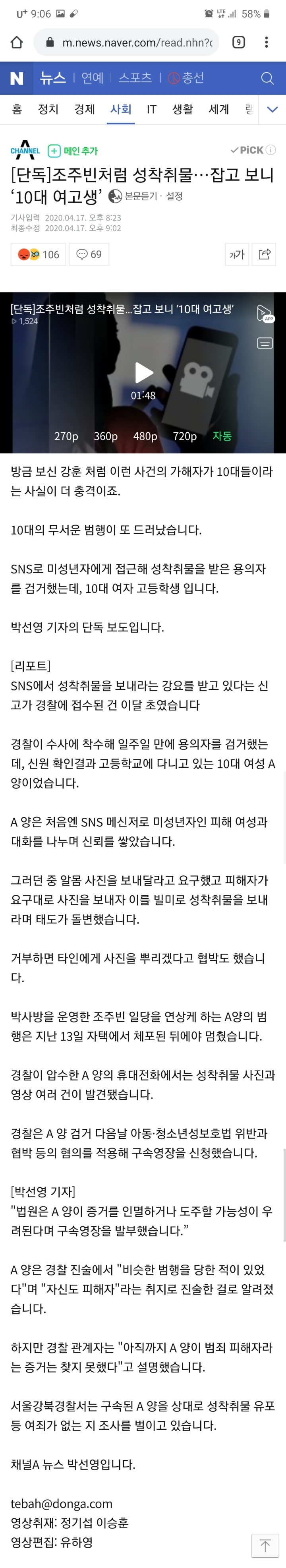 [단독]조주빈처럼 성착취물…잡고 보니 ‘10대 여고생’ 작성자스토브리그|작성시간20.04.17|조회수3,925 목록 댓글 15 글자크기 작게가 글자크기 크게가 https://m.news.naver.com/read.nhn?oid=449&aid=0000190319&sid1=102&mode=LSD 다음검색 현재 게시글 추가 기능 열기 북마크 공유하기 신고 센터로 신고 댓글 댓글 15 댓글쓰기 답글쓰기 댓글 리스트 작성자달좋은밤 | 작성시간 20.04.17 n번방에 속한 가해자가 아니고 다른 성착취사건임 작성자풍바라기 | 작성시간 20.04.17 작성자수학의정석 | 작성시간 20.04.17 n번방이랑 수법똑같네 변명대는거보니 강력하게 처벌했으면 좋겠다 작성자퀵빛짹푼핸♥ | 작성시간 20.04.17 당하긴 무슨..한 패거리면서.. 작성자Love Virus | 작성시간 20.04.17 이년 신상공개부터 가자 댓글 전체보기
