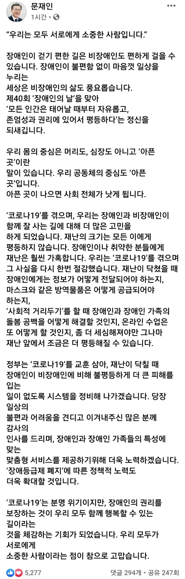 [SNS]문대통령님 페이스북(장애인의 날) 작성자아모트|작성시간20.04.20|조회수658 목록 댓글 4 글자크기 작게가 글자크기 크게가 https://www.facebook.com/181808448592182/posts/2585902971516039/ 다음검색 현재 게시글 추가 기능 열기 북마크 공유하기 신고 센터로 신고 댓글 댓글 4 댓글쓰기 답글쓰기 댓글 리스트 작성자토착왜구 | 작성시간 20.04.20 우리 공동체의 중심도 '아픈 곳'입니다.대통령님 이 말씀 가슴에 새기겠습니다 작성자레알의 심장 | 작성시간 20.04.20 글을 참 따뜻하게 쓰심 작성자꾸레레 | 작성시간 20.04.20 감사합니다 대통령님^^ 특수교사로서 힘이 나네여 작성자구르미 | 작성시간 20.04.20 댓글 전체보기