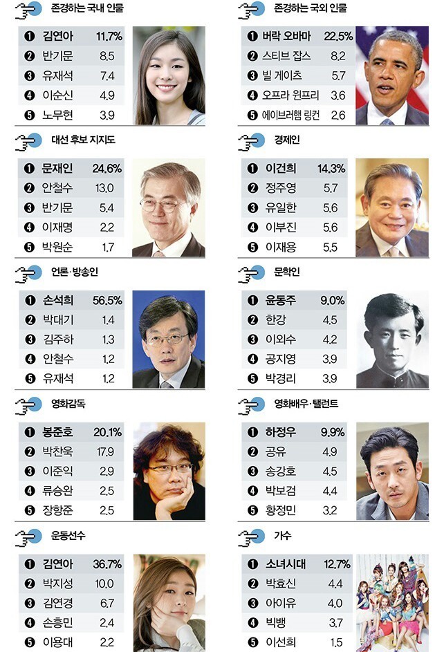 2016년 대학생들이 존경하는 인물 작성자Leonardo Bonucci|작성시간16.10.20|조회수1,333 목록 댓글 8 글자크기 작게가 글자크기 크게가 . 다음검색 현재 게시글 추가 기능 열기 북마크 공유하기 신고 센터로 신고 댓글 댓글 8 댓글쓰기 답글쓰기 댓글 리스트 작성자L.Messi | 작성시간 16.10.20 손석희 지분이... ㅎㄷㄷ;; 작성자시베리아 | 작성시간 16.10.20 갓석희 압도적인거봐 작성자moscow~~ | 작성시간 16.10.20 박대기기자가 유재석이겼네ㅋㅋㅋ 작성자장에는GG | 작성시간 16.10.20 반기문? 작성자갓세정이자나 | 작성시간 16.10.21 반기문은 진짜 실패한 사무총장인데 그냥 UN이라 그런가 댓글 전체보기