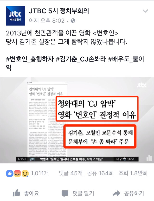 박근혜 대통령 비서실장 재직 시, 영화 '변호인'이 흥행하자 대놓고 CJ를 "손 좀 봐라"고 했던 김기춘.