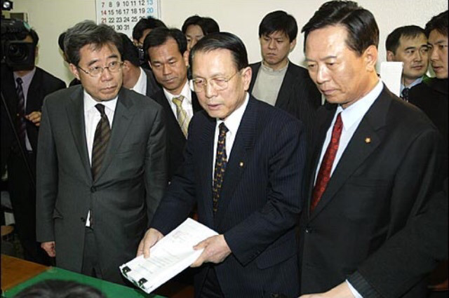 2004년 노무현 대통령 탄핵 정국 땐, 한나라당 소속의 법사위원장으로 검사 격인 탄핵소추위원을 맡았던 김기춘.