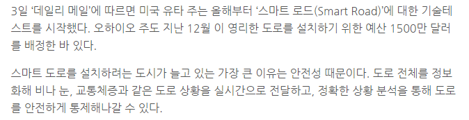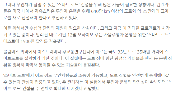 [기사]스마트 하이웨이 시대가 열린다 작성자더락|작성시간17.01.04|조회수424 목록 댓글 0 글자크기 작게가 글자크기 크게가 ‘꿈의 도로’라고 불리던 ‘스마트 도로’ 주행 실험이 미국 유타 주 등에서 시작되고 있다. 주행실험의 초점이 무인차에 집중되고 있다. ⓒhongkiat.comhttp://www.sciencetimes.co.kr/?news=%EC%8A%A4%EB%A7%88%ED%8A%B8-%ED%95%98%EC%9D%B4%EC%9B%A8%EC%9D%B4-%EC%8B%9C%EB%8C%80%EA%B0%80-%EC%97%B4%EB%A6%B0%EB%8B%A4 다음검색 현재 게시글 추가 기능 열기 북마크 공유하기 신고 센터로 신고 댓글 댓글 0 댓글쓰기 답글쓰기 댓글 리스트