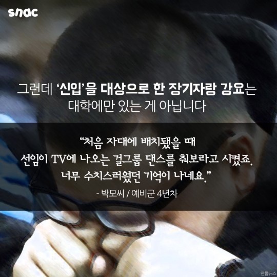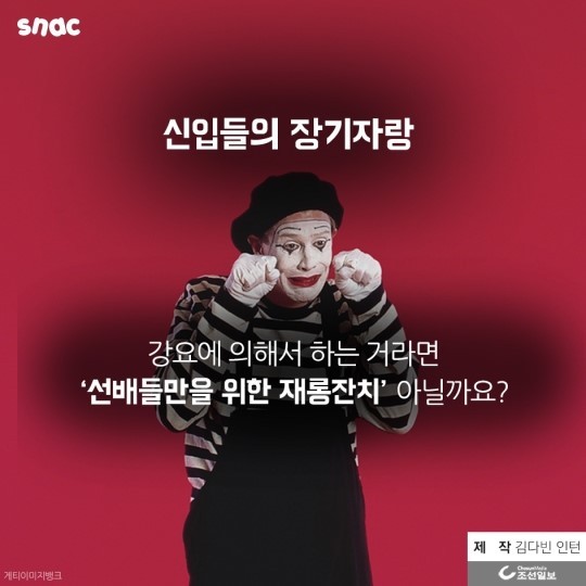 작성자포로리 작성시간 17.02.10 이거 진짜 왜하는지 모르겠음. 하고싶은애들만 하면되는데 하기싫은데 억지로 해야되니낀 문제임. 저런거 연습하면서 군기잡는 이상한 선배가 한둘이 아님.