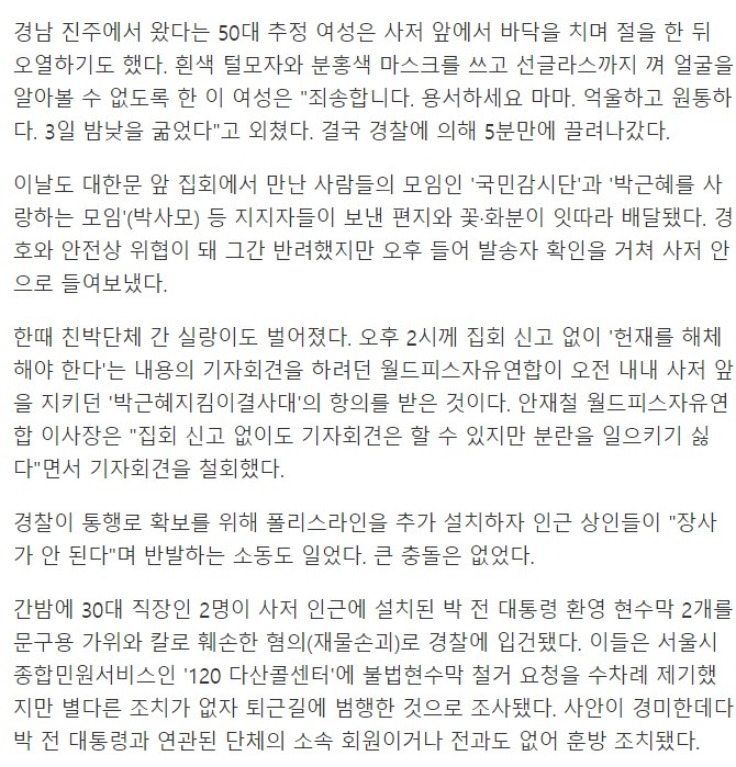 [기사]"마마" 朴 사저 앞서 큰절한 지지자.. 친박단체간 실랑이도 작성자ㄴㅇㄴㅇ|작성시간17.03.15|조회수823 목록 댓글 8 글자크기 작게가 글자크기 크게가 http://v.media.daum.net/v/20170315210221464 다음검색 현재 게시글 추가 기능 열기 북마크 공유하기 신고 센터로 신고 댓글 댓글 8 댓글쓰기 답글쓰기 댓글 리스트 작성자존경하는국민여러분 | 작성시간 17.03.15 사저x자택o 작성자Lothar matthaus | 작성시간 17.03.15 마마 ㅋㅋㅋㅋㅋㅋㅋㅋㅋㅋㅋㅋㅋㅋㅋㅋㅋㅋㅋㅋㅋㅋㅋㅋㅋㅋ 작성자Vivid | 작성시간 17.03.15 마마 재방송은 인터넷으로 봐주시옵소서 마마 작성자차에코푼새키 | 작성시간 17.03.15 한달만 더 굶길 작성자안드레 이니에스타 | 작성시간 17.03.15 마마~~~~ 우우우~~~ 댓글 전체보기