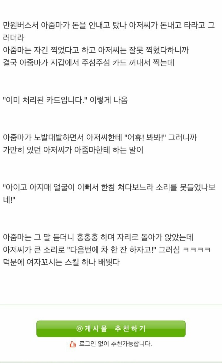 카사노바 버스아저씨 작성자공설아|작성시간17.03.18|조회수132,837 목록 댓글 3 글자크기 작게가 글자크기 크게가 출처 웃대 다음검색 현재 게시글 추가 기능 열기 북마크 공유하기 신고 센터로 신고 댓글 댓글 3 댓글쓰기 답글쓰기 댓글 리스트 작성자호이호이짱구 | 작성시간 17.03.18 ㅋㅋㅋㅋㅋㅋㅋㅋㅋㅋㅋㅋㅋㅋㅋㅋㅋㅋㅋㅋㅋㅋㅋㅋㅋㅋㅋㅋㅋ 작성자かやのみ | 작성시간 17.03.18 와 센스 ㅋㅋㅋㅋㅋㅋ 작성자Bluemoons | 작성시간 17.03.18 ㅋㅋㅋㅋㅋㅋㅋㅋㅋㅋㅋㅋㅋㅋㅋ 댓글 전체보기