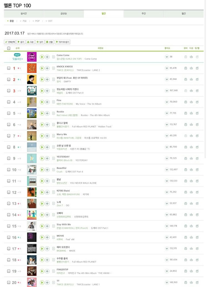 [아이돌][트와이스] 멜론 일간차트 1위 복귀 작성자지효|작성시간17.03.18|조회수811 목록 댓글 10 글자크기 작게가 글자크기 크게가 실시간차트도 1위 유지중 다음검색 현재 게시글 추가 기능 열기 북마크 공유하기 신고 센터로 신고 댓글 댓글 10 댓글쓰기 답글쓰기 댓글 리스트 작성자라잎 = 에디 | 작성시간 17.03.18 굿 작성자사나 | 작성시간 17.03.18 오홍 작성자스페인 | 작성시간 17.03.18 굿 작성자OverviewEffect | 작성시간 17.03.18 ㄷㄷ 작성자Someone Else | 작성시간 17.03.18 아이유 나올때까진 버틸듯 싶네요 댓글 전체보기