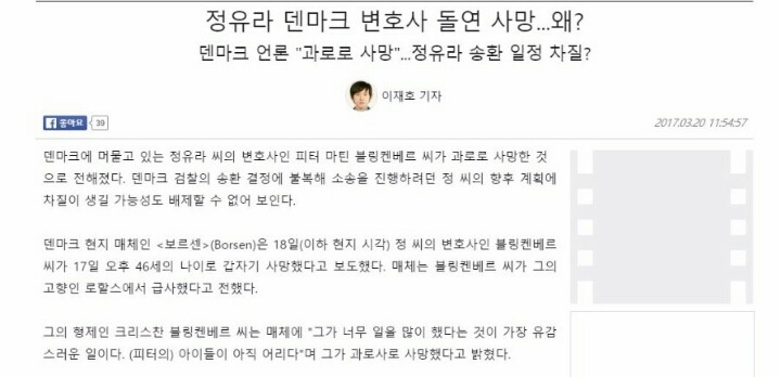 덴마크 현지 매체인 보르센은 18일 (현지시각) 정 씨의 변호사인 블링켄베르 씨가 17일 오후 46세의 나이로 갑자기 사망했다고 보도했다. 매체는 블링켄베르 씨가 그의 고향인 로할스에서 급사했다고 전했다.