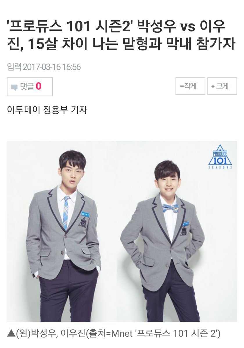 [프로듀스101] 15살 차이나는 최고령,최연소 연습생.jpg 작성자시월달애|작성시간17.03.21|조회수36,528 목록 댓글 6 글자크기 작게가 글자크기 크게가 까치발 박성우 30살 비주얼 훈훈하고 군필에 미담 다수보이스 키즈 출신 15살 이우진꾀꼬리같은 음색 보컬실력이 기대됨 손흥민 닮았다고하던데 아직 겁나 애기 다음검색 현재 게시글 추가 기능 열기 북마크 공유하기 신고 센터로 신고 댓글 댓글 6 댓글쓰기 답글쓰기 댓글 리스트 작성자우주소녀 선의 | 작성시간 17.03.21 프듀 여자버전도 저정도 차이났던거같은데 ㅋㅋㅋ 삭제된 댓글입니다. 답댓글 작성자북한산고라니 | 작성시간 17.03.21 라잎 = 에디 문복이를 위해서도 ㅋㅋㅋㅋㅋㅋㅋㅋㅋ 작성자심술안부리기 | 작성시간 17.03.21 밑에 애 손흥민말고 제시 아이젠버그도 보임ㅋㅋㅋ 작성자포로리 | 작성시간 17.03.21 우리흥ㅋㅋ 이우진 축구선수가 꿈이었다네요. 포지션은 미드필더고 호날두 좋아한다고 했어요!! 귀여움ㅋㅋㅋ 댓글 전체보기