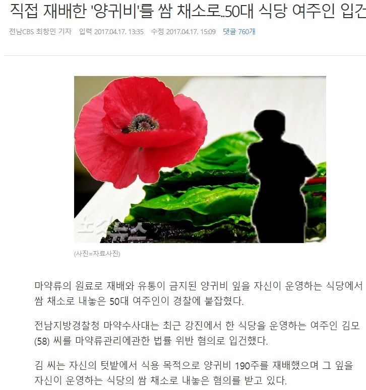 [기사]직접 재배한 '양귀비'를 쌈 채소로…50대 식당 여주인 입건 작성자ㄴㅇㄴㅇ|작성시간17.04.18|조회수1,460 목록 댓글 5 글자크기 작게가 글자크기 크게가 http://www.nocutnews.co.kr/news/4769086 다음검색 현재 게시글 추가 기능 열기 북마크 공유하기 신고 센터로 신고 댓글 댓글 5 댓글쓰기 답글쓰기 댓글 리스트 작성자ㄴㅇㄴㅇ 작성자 본인 여부 작성자 | 작성시간 17.04.18 ㄷㄷ 작성자취급주의 | 작성시간 17.04.18 한번 맛보면 단골식당행 작성자be good | 작성시간 17.04.18 밥 엄청 먹었겠네 ... 작성자GTX1080 | 작성시간 17.04.18 중국에서 이런다고 하더니 ㅋㅋㅋㅋ 작성자Poetic Justice | 작성시간 17.04.18 마약쌈밥 댓글 전체보기
