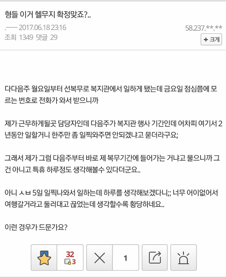 작성자사랑방막내 작성시간 17.06.19 담당자 마인드 터진듯 ㅋㅋ복무일이 언제부터라고 정해져 있는데 그거 무시하고 자기 맘대로 일주일 먼저 나오라마라네 실화면 바로 신문고 써야 되는거임 미리 나와서도 안되고 ㅋㅋ세상엔 또라이가 많군요