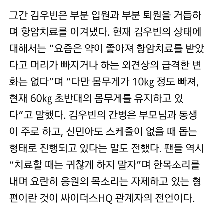 [연예]‘비인두암’ 김우빈 현재 상황…“몸무게 10kg 빠졌으나 운동할 정도로 건강 회복” 작성자Seoul&liv|작성시간17.07.28|조회수4,298 목록 댓글 18 글자크기 작게가 글자크기 크게가 http://m.entertain.naver.com/read?oid=144&aid=0000504648 다음검색 현재 게시글 추가 기능 열기 북마크 공유하기 신고 센터로 신고 댓글 댓글 18 댓글쓰기 답글쓰기 댓글 리스트 작성자백악관 | 작성시간 17.07.28 와 세상에... 빨리 완치하길ㅠㅜ 작성자FINN BALOR | 작성시간 17.07.28 빨리 완치하시길 작성자영원한 캡틴박 | 작성시간 17.07.28 꼭 완치할 수 있을겁니다!!! 작성자시인 윤동주 | 작성시간 17.07.28 아 맞딘 김우빈...암이었지 참...잘 이겨내서 다행이다 진짜... 작성자와꾸대장봉준 | 작성시간 17.07.29 김우빈 수지 주연 드라마 비슷한내용아닌가;; 댓글 전체보기