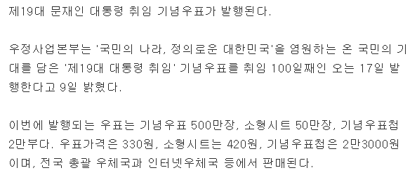[정치]문재인 대통령 취임 기념우표, 오는 17일 발행 작성자포카리스웨트|작성시간17.08.09|조회수652 목록 댓글 4 글자크기 작게가 글자크기 크게가 http://news.naver.com/main/read.nhn?mode=LSD&mid=sec&sid1=105&oid=014&aid=0003856339 다음검색 현재 게시글 추가 기능 열기 북마크 공유하기 신고 센터로 신고 댓글 댓글 4 댓글쓰기 답글쓰기 댓글 리스트 작성자sports | 작성시간 17.08.09 하루컷봅니다. 이니 굿즈중에 가장 많이 팔릴것 같네여 답댓글 작성자대발 | 작성시간 17.08.09 하루도 안가서 1-2시간만에 완판될듯 작성자doflamingo | 작성시간 17.08.09 오늘의 동지가 저날은 적이 되는 날이네 작성자토템풋볼 | 작성시간 17.08.09 나도 좀 삽시다 제발 댓글 전체보기