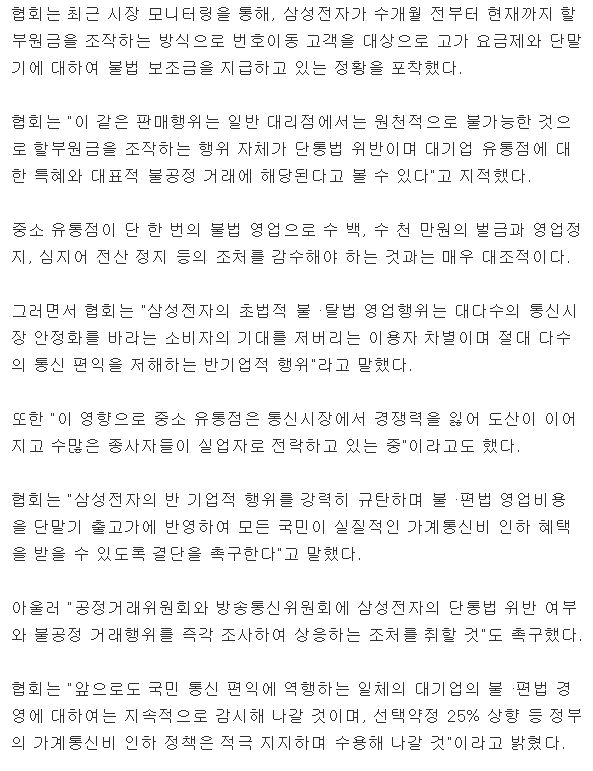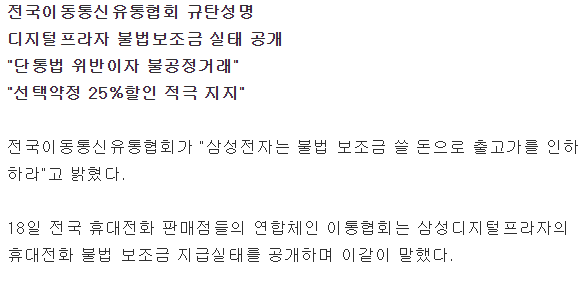 [기사]"삼성전자, 불법보조금 쓸 돈으로 출고가 내려야" 작성자포카리스웨트|작성시간17.08.18|조회수626 목록 댓글 1 글자크기 작게가 글자크기 크게가 http://news.naver.com/main/read.nhn?mode=LSD&mid=sec&sid1=105&oid=277&aid=0004057225 다음검색 현재 게시글 추가 기능 열기 북마크 공유하기 신고 센터로 신고 댓글 댓글 1 댓글쓰기 답글쓰기 댓글 리스트 작성자CesMorata | 작성시간 17.08.18 휴대전화 판매점 연합회??? 단통법으로 장난은 판매점들이 더 잘치는거같은데... 댓글 전체보기