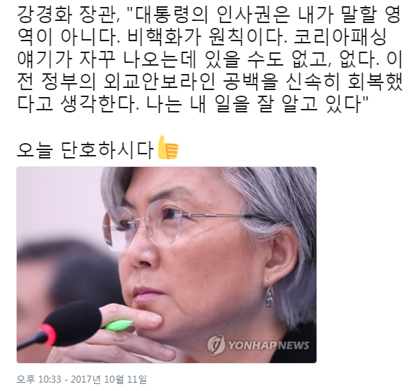 [정치]강경화 장관, "대통령의 인사권은 내가 말할 영역이 아니다.