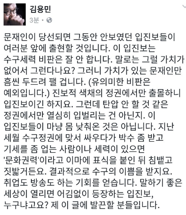 입진보 저격하는 김용민 페북.jpg 작성자Spiderman|작성시간17.10.24|조회수3,195 목록 댓글 13 글자크기 작게가 글자크기 크게가 틀린 말 하나 없자너 다음검색 현재 게시글 추가 기능 열기 북마크 공유하기 신고 센터로 신고 댓글 댓글 13 댓글쓰기 답글쓰기 댓글 리스트 작성자soberstone | 작성시간 17.10.24 괙폭 오졌다.. 작성자Series | 작성시간 17.10.24 역시 애국보수 작성자심곡동 득점왕 | 작성시간 17.10.24 한경오줌 작성자헌신적인악마 | 작성시간 17.10.24 예전에 알던 급진보 애들이 이럼 작성자노랑 줄무늬 | 작성시간 17.10.24 세분화되어 설명해주니 좋다 댓글 전체보기