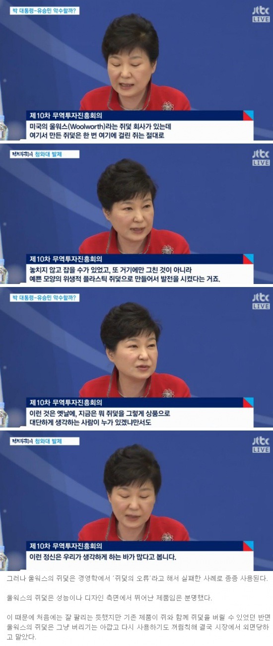 울워스 쥐덫은 ‘제품·기술 중심적 사고의 오류’ 사례로 회자 되고 있는데, 박근혜 대통령은 이를 성공사례로 잘못 언급