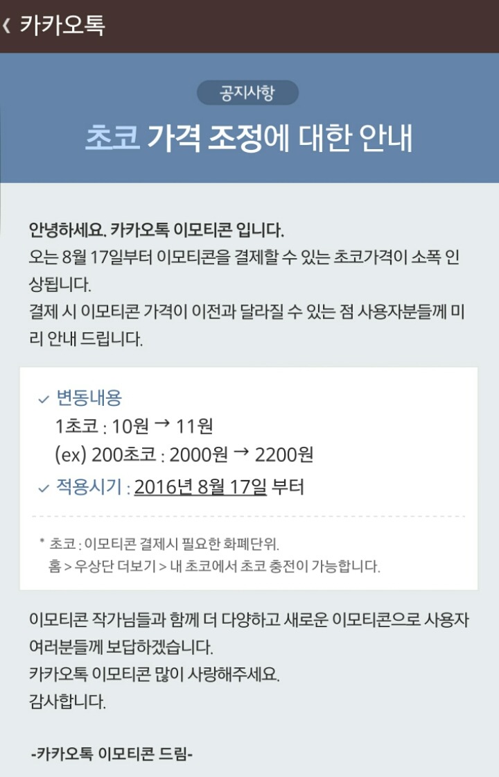 카카오톡 이모티콘 가격인상 작성자지효|작성시간16.07.19|조회수2,449 목록 댓글 5 글자크기 작게가 글자크기 크게가 미방은 라이언초코가격이 오르면 이모티콘 가격이 오름 다음검색 현재 게시글 추가 기능 열기 북마크 공유하기 신고 센터로 신고 댓글 댓글 5 댓글쓰기 답글쓰기 댓글 리스트 작성자탱디줴이!! | 작성시간 16.07.19 아이폰은 달러 계산이라 작성자Woodyinho | 작성시간 16.07.19 초코 노가다 열심히 하면 금방 모음 ㅋㅋ 답댓글 작성자Ajax | 작성시간 16.07.19 어떻게 해요? 답댓글 작성자그레이브즈 | 작성시간 16.07.19 어캐해요? 답댓글 작성자Woodyinho | 작성시간 16.07.19 Ajax 초코충전 들어가면 무료 충전하는거 나와요 ㅋㅋ 댓글 전체보기