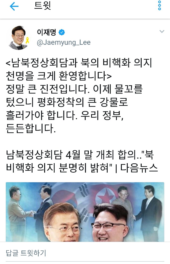 [정치]이재명 트윗 작성자Iceland|작성시간18.03.06|조회수3,202 목록 댓글 15 글자크기 작게가 글자크기 크게가 . 다음검색 현재 게시글 추가 기능 열기 북마크 공유하기 신고 센터로 신고 댓글 댓글 15 댓글쓰기 답글쓰기 댓글 리스트 답댓글 작성자노랑 줄무늬 | 작성시간 18.03.06 2222222222 답댓글 작성자GALANTIS | 작성시간 18.03.06 3손가혁..하.. 답댓글 작성자얇은귀여움 | 작성시간 18.03.07 4444444 답댓글 작성자토템풋볼 | 작성시간 18.03.07 55555 작성자심재원 송종국 | 작성시간 18.03.06 이사람 웬일로 북한 관련 글 올리면서 불평 안하네 ㅋㅋㅋ 댓글 전체보기