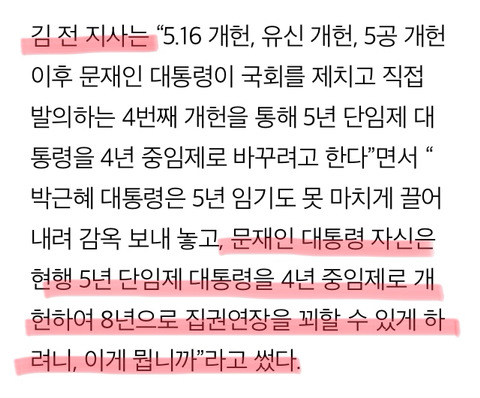 이 헌법 조항을 바꾸거나 삭제하면 문 대통령도 연임 가능하다고 우길 사람은 ‘소급입법금지의 원칙’에 대해 일단 공부하고 오시길.