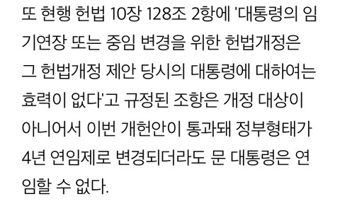 : 대통령 임기에 관련한 개헌을 하더라도 현직인 문 대통령에겐 적용되지 않게 이미 헌법에 명시됨.