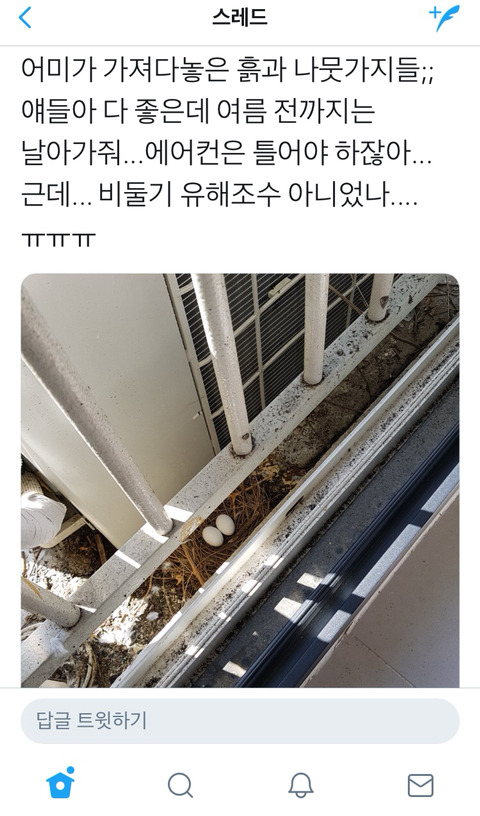 서유리 트위터(세입자 근황) 작성자울롱울|작성시간18.03.30|조회수2,544 목록 댓글 7 글자크기 작게가 글자크기 크게가 부화함...비둘기새끼 처음 보네여..밑에는 처음 세입자 발견할 당시 트윗 다음검색 현재 게시글 추가 기능 열기 북마크 공유하기 신고 센터로 신고 댓글 댓글 7 댓글쓰기 답글쓰기 댓글 리스트 작성자Suwon Bluewings | 작성시간 18.03.30 비둘기새끼가 참새라던새끼 나와 작성자류수정 | 작성시간 18.03.30 애기때도 극혐이네 작성자★울산★ | 작성시간 18.03.30 윽...다크면 집 없애야 할듯 작성자박정화 | 작성시간 18.03.30 으악 작성자류화영남자친구 | 작성시간 18.03.30 둘기둘기 댓글 전체보기