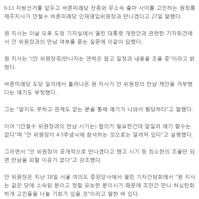 [기사]안철수, "원희룡은 우리당의 자산이니 연락해서 만나겠다" 작성자무명씨|작성시간18.04.02|조회수297 목록 댓글 0 글자크기 작게가 글자크기 크게가 응, 원희룡이는 좀 있으면 우리 당 사람 아니야.http://news1.kr/articles/?3278163 다음검색 현재 게시글 추가 기능 열기 북마크 공유하기 신고 센터로 신고 댓글 댓글 0 댓글쓰기 답글쓰기 댓글 리스트