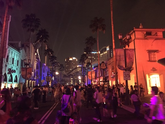 밤의 유니버셜 스튜디오.. 할로윈 기간이라 좀비들 돌아다닙니다 잘보면 뚱뚱이 좀비도 있어요