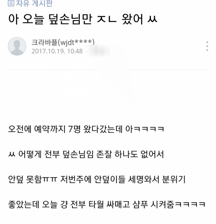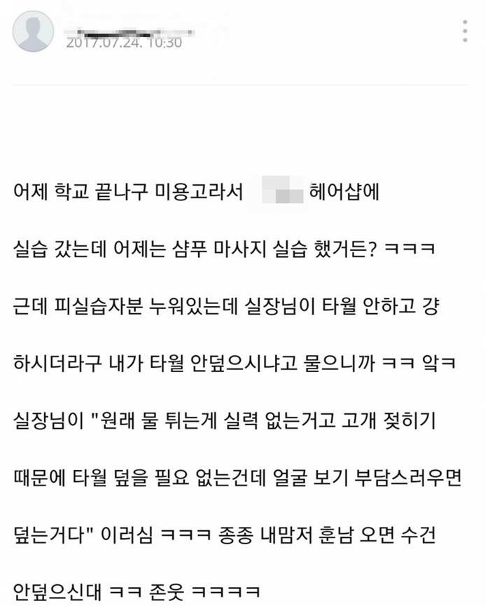 미용실에서 머리 감을때 수건 덮어주는 이유 작성자박지성 지단 메시|작성시간18.04.11|조회수3,159 목록 댓글 10 글자크기 작게가 글자크기 크게가 . 다음검색 현재 게시글 추가 기능 열기 북마크 공유하기 신고 센터로 신고 댓글 댓글 10 댓글쓰기 답글쓰기 댓글 리스트 작성자KIMSOHYUN | 작성시간 18.04.11 어 저는 타월로 안덮던데 작성자동피랑 | 작성시간 18.04.11 어제 안덮던데ㅋㅋ 작성자Suzy | 작성시간 18.04.11 허허 작성자동물칭쿠칭쿠 | 작성시간 18.04.11 난 진짜 한번도 안덮음ㅋㅋㅋ 작성자풍운아 | 작성시간 18.04.11 나는 갈때마다 덮던데 댓글 전체보기