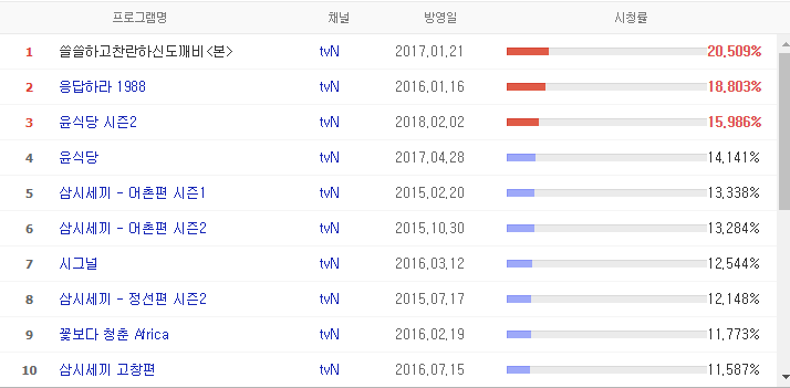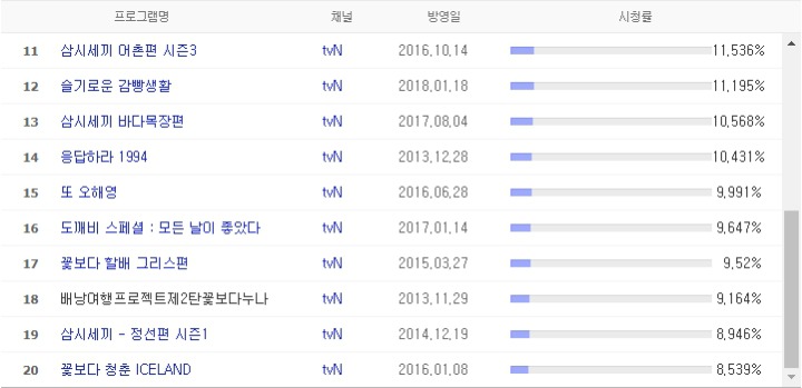 TVN 역대 시청률 순위 작성자Suzy|작성시간18.04.23|조회수8,989 목록 댓글 14 글자크기 작게가 글자크기 크게가 . 다음검색 현재 게시글 추가 기능 열기 북마크 공유하기 신고 센터로 신고 댓글 댓글 14 댓글쓰기 답글쓰기 댓글 리스트 작성자호날두 | 작성시간 18.04.23 나피딬ㅋㅋㅋㅋㅋㅋㅋ거기다 이우정작가 위엄 작성자얇은귀여움 | 작성시간 18.04.23 아프리카편 망했다더니.... 작성자시바犬 | 작성시간 18.04.23 도깨비ㄷㄷㄷ 작성자맨유는중앙을영입해야챔스우승함 | 작성시간 18.04.23 금나와라 와라 뚜욱딱! 작성자DONBALON | 작성시간 18.04.23 김은숙의 위엄ㄷㄷ 그나저나 또 오해영 안봐서 모르겠는데 10프로를 아깝게 못넘었네요 댓글 전체보기