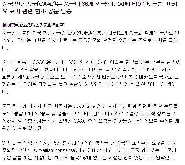 [기사]中정부 "타이완 국가 표기 말라" 요청에 韓항공사들 수용 움직임 작성자포카리스웨트|작성시간18.05.07|조회수862 목록 댓글 2 글자크기 작게가 글자크기 크게가 http://news.naver.com/main/read.nhn?mode=LSD&mid=sec&oid=079&aid=0003098504&sid1=001 다음검색 현재 게시글 추가 기능 열기 북마크 공유하기 신고 센터로 신고 댓글 댓글 2 댓글쓰기 답글쓰기 댓글 리스트 작성자한시사십이분 | 작성시간 18.05.07 넘나 지들위주 생각이 강함 작성자발리뮬리아 | 작성시간 18.05.07 우리나라도 힘없으면 얼마든지 흔들겠죠 댓글 전체보기